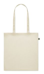 Dieser Einkaufsbeutel ist aus 140 g/m² Post-Consumer-Baumwolle gefertigt (65 % recycelte Baumwolle, 35 % Baumwolle).